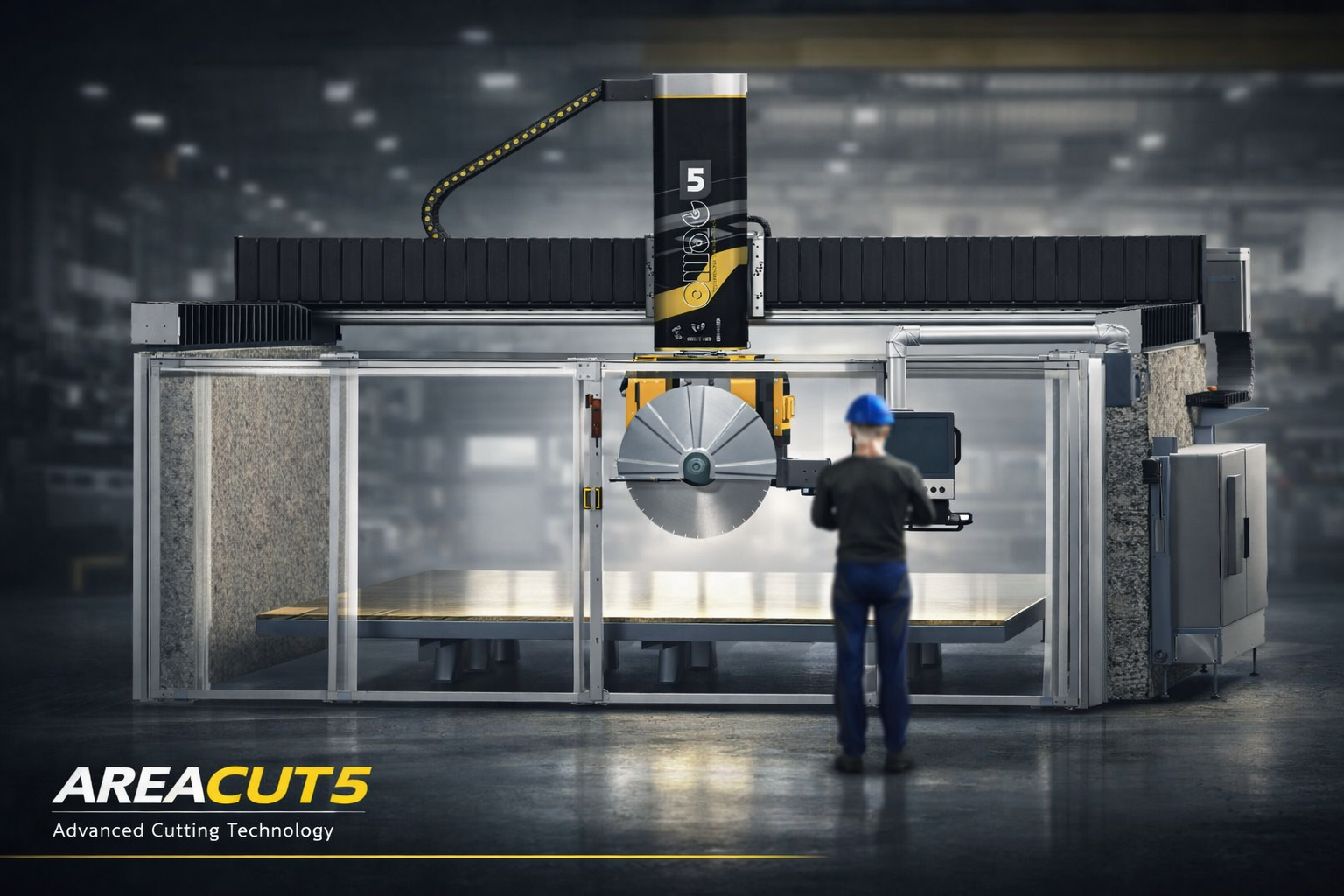 NC bridge saw 5 axes with milling functions, positioned on concrete walls, with twist head, specially engineered to cut, drill, polishing and shape items of granite, marble, quartz, porcelain and ceramic.
